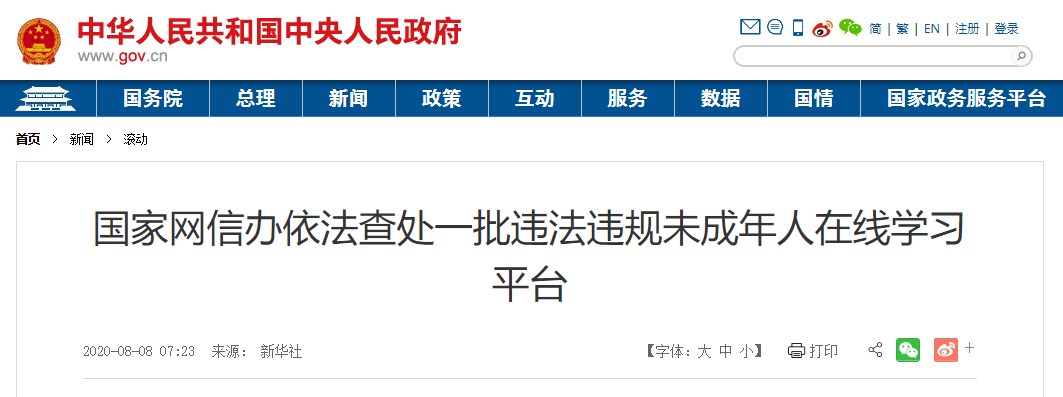 國家網(wǎng)信辦在7月初啟動(dòng)的2020“清朗”未成年人暑期網(wǎng)絡(luò)環(huán)境專項(xiàng)整治中,聚焦網(wǎng)站平臺(tái)網(wǎng)課學(xué)習(xí)頻道、學(xué)習(xí)教育類APP、工具類應(yīng)用彈窗等未成年人常用的環(huán)節(jié)和應(yīng)用